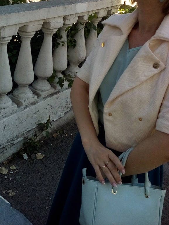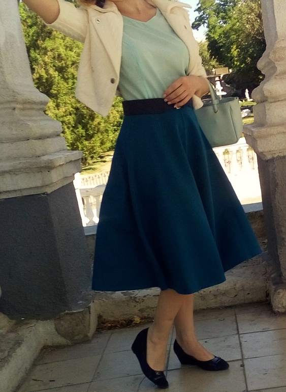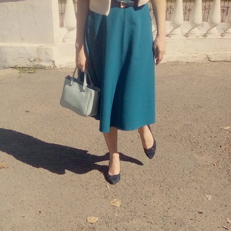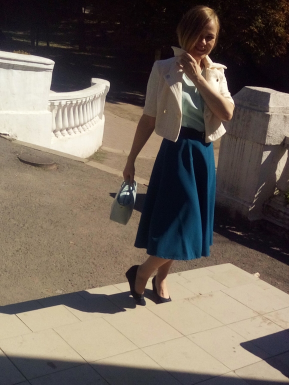 Отлично по цветам получилось! Очень интересно с голубым юбка смотрится. Только, простите, обувь вам не по возрасту, какая-то бабушкина. Сюда или каблук, или балетки совсем без каблука. Ну каблук конечно лучше.