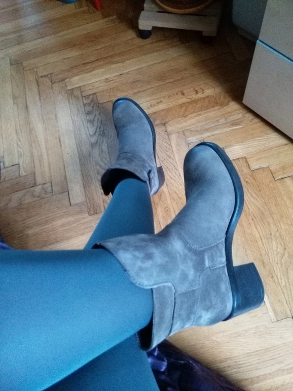 ОбувьДевочки, в прошлый раз вы мне очень помогли и отговорили от бртинок цвета морской волны, спасибо большое, где были мои глаза?! Теперь я сомневаюсь по поводу сапожек, купила, сначала нравились, думаю оставить или нет. Замша, цвет скорее серый с бежевым. Понравилось, что удобно и с колготками и джинсы можно заправить.