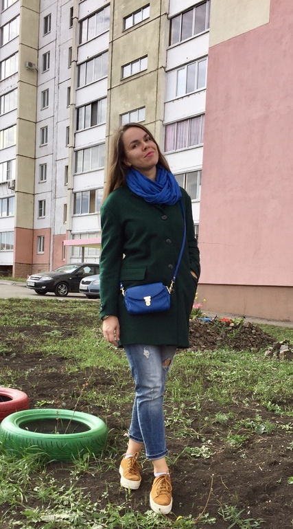 Так красиво! Я бы шарф поменяла, на мультиколор, и тогда любые брюки сюда будут в тему.