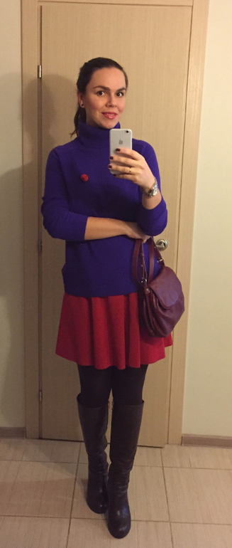 Прикольно)))я бы или свитерок подоткнула как-то или юбочку пониже опустила😀