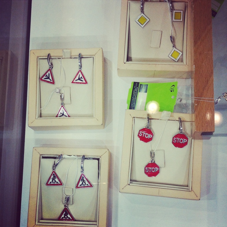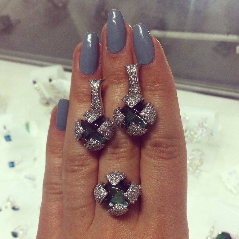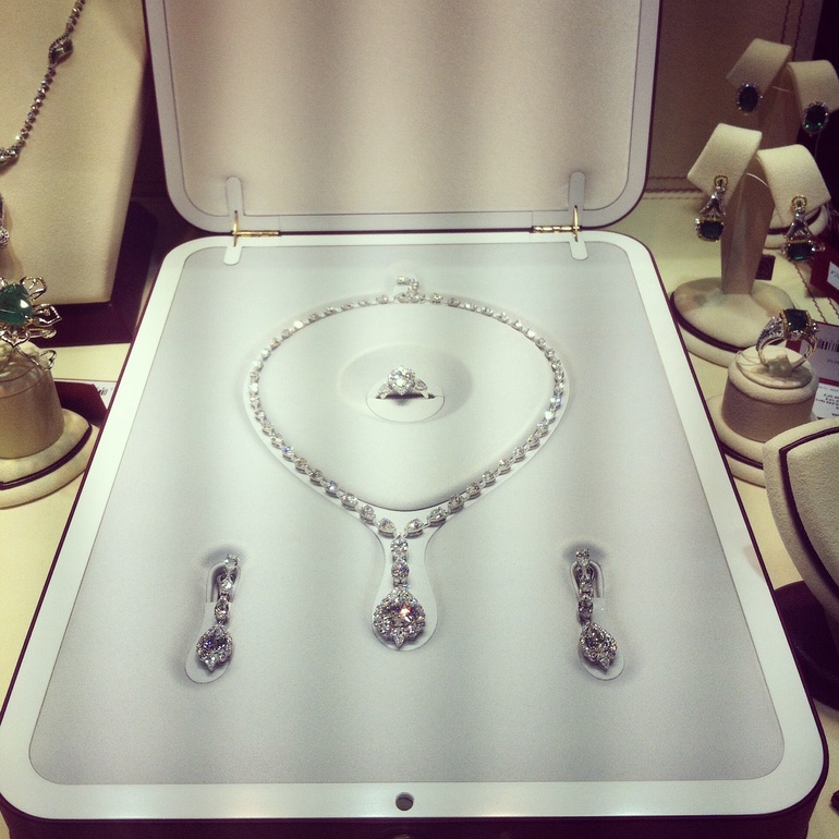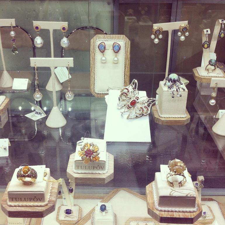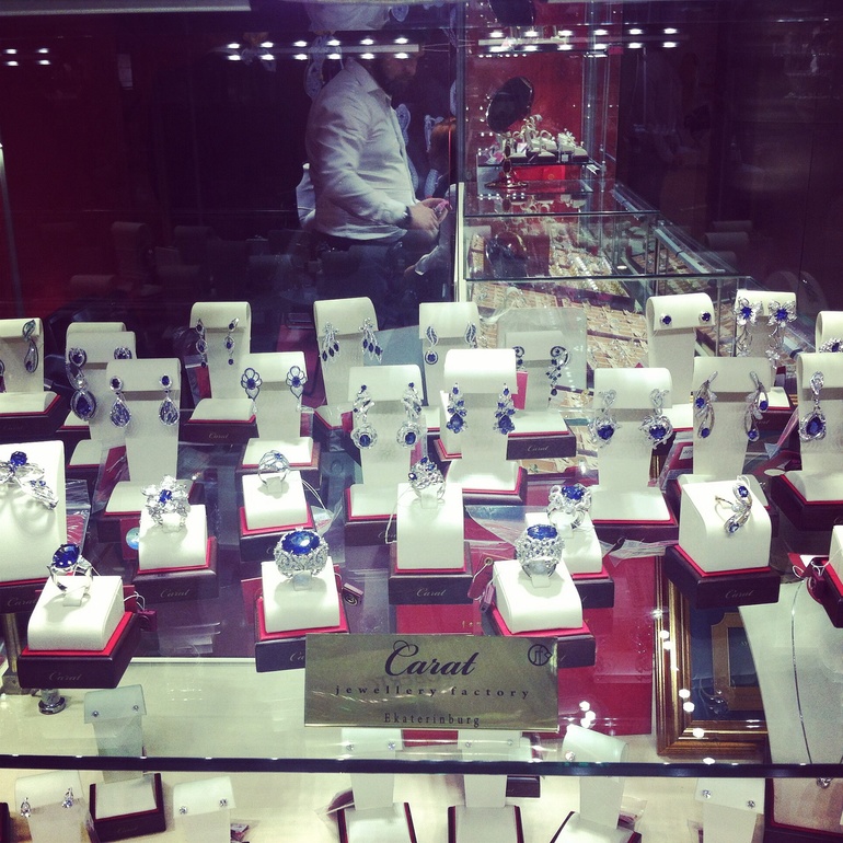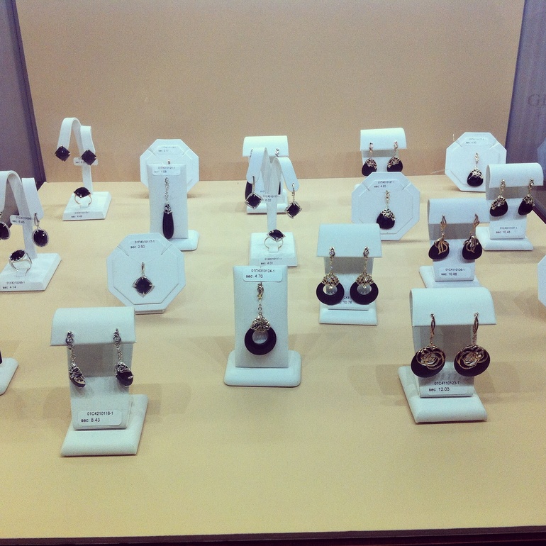 эти бубошки - это серебро . блестит невозможно как . стоит примерно 18 тысяч . в серебре фианитики и топаз кабашоном граненный. но я не уточняла натуральный или нет , мне это изделие очень понравилось . я его присмотрела . скорее всего куплю и мне плевать , что там за камни. но можно и в золоте с бриллиантами . цена уж там наверное большая . какая то ростовская компания НЕФРИТ . а с черными камнями помнится это компания эстет . кажется керамика , но я не знаю точно . они стоят прям в центральный вход войдете и прямо , как бы в холле .