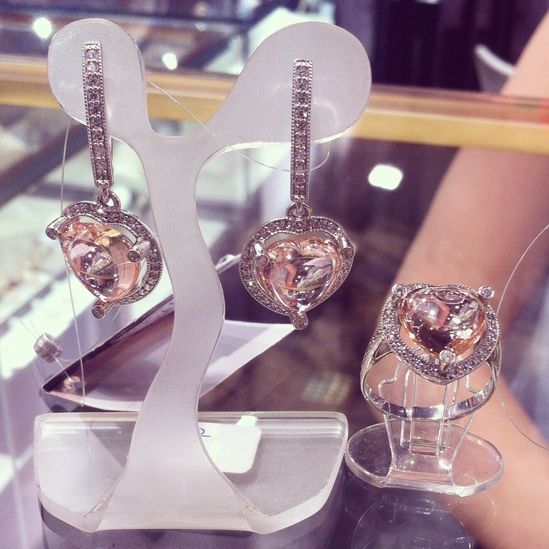 Помню . Это серебро . С фианитами . Компания золотые купола . Розовый камень сказали морганит ( еще называется воробьевит) . Но мне кажется это ненатуральная вставка , потому что украшения с морганитом оооооооочень дорогие , а тут вообщем бюджетно , точно опять же не скажу . Но красиво смотрится и очень нежно .