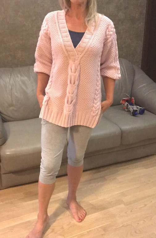 Мне нравится. И цвет очень приятный и коса не смущает, хотя ее "растяжимость", явно на животик задумывалась. Но вязанные вещи можно так постирать и отпарить, что и форму и размер поменять))