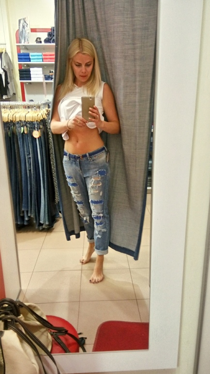Туфли отпад, очень красивые, джины не нравятся, смотрятся дешево, лучше простые джинсы, ну или хотя бы с дырками, но без вот таких синих нашивок и страз, слегка подвернуть и с туфлями и белым верхом будет красиво. Фигура класс!