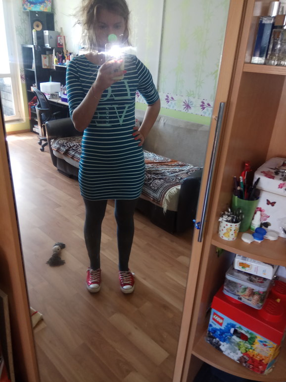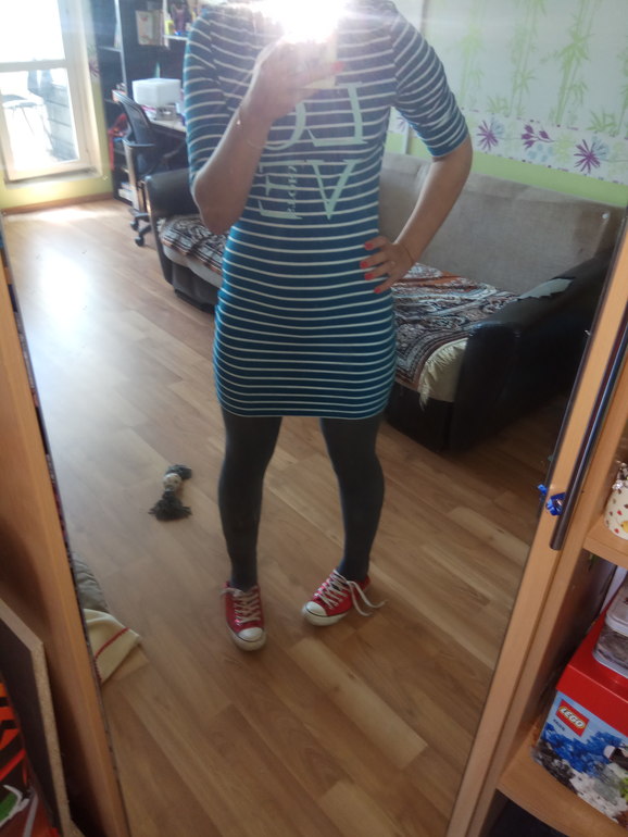Ps: колготки серые, платье сине-белое, кеды красные)) ну явно светофор..