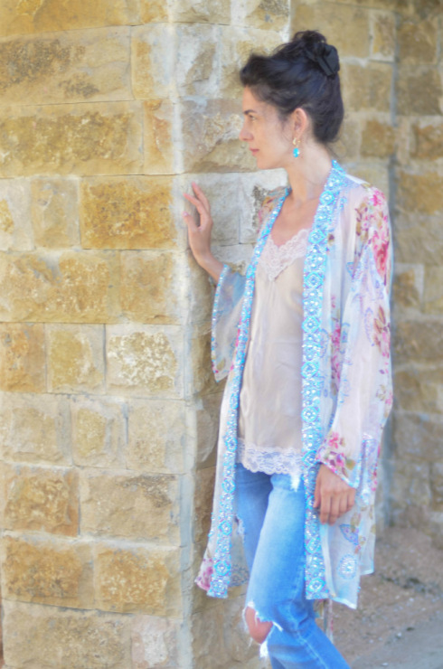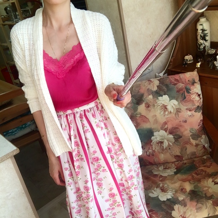 У меня есть базовый цвет, там вообще просто. А есть два ярких. Вот этот, цвета фуксии я ношу с юбкой, по качеству такая же, шелковая. А вот сверху надеваю мягкий вязаный кардиган. На теплые вечера, самое оно.