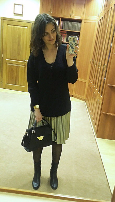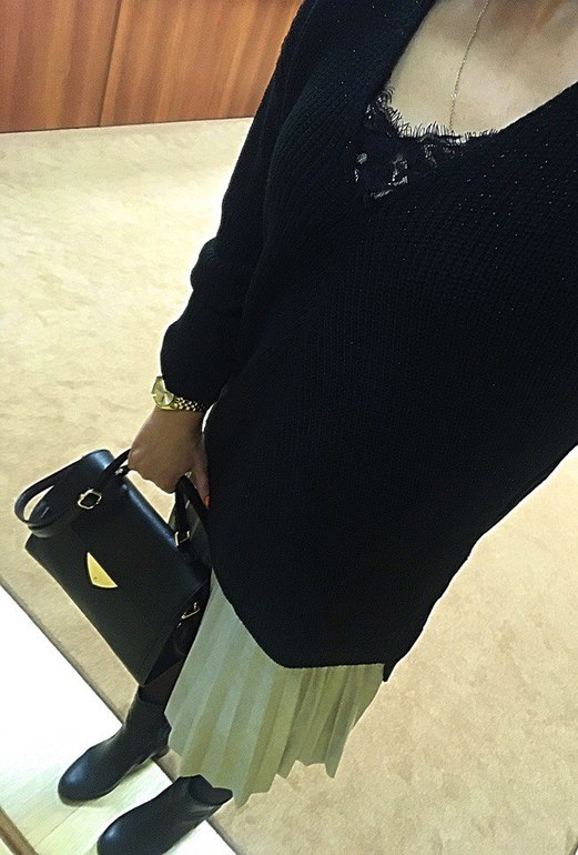 Вот ближе. Так как вырез слишком глубокий для работы и моей начальницы, под свитер я надела топ с кружевом, купленный в НМ специально для таких случаев.
