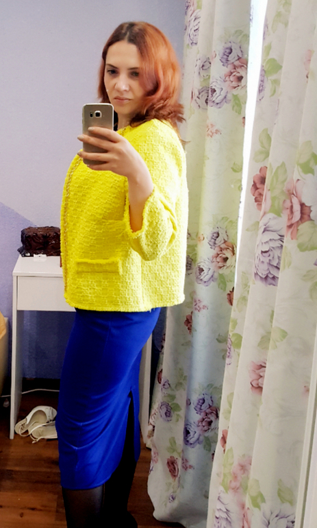 Мисс Яркость! :) Красиво; желтый + синий! И смелость, такой яркий желтый носить :)) Улыбайся! :)
