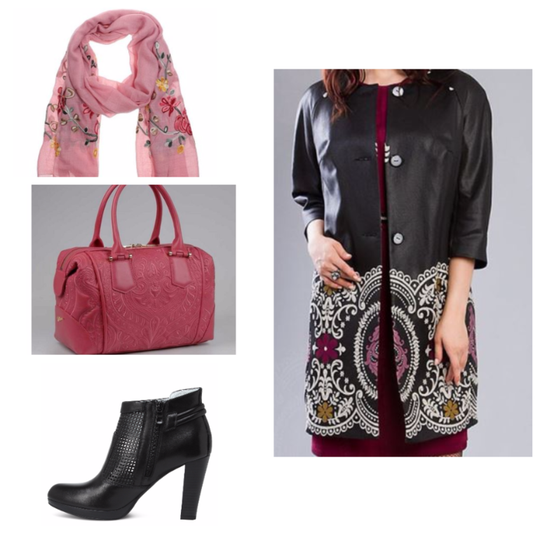 Шарф однотонный грязно-розовый. Сумка и туфли черные, без цветуечков. Можно глубоко бордово, винные туфли.