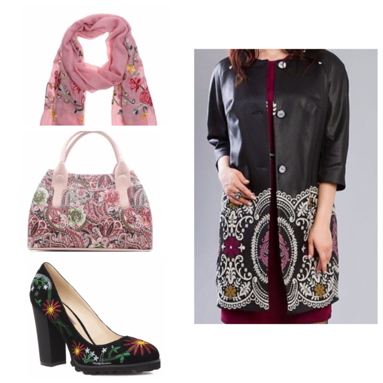 Аксы я бы взяла однотонные. И так много декора. Например, сумку горчичную как цветочки маленькие,обувь черную,шарф розовый