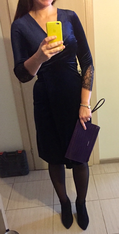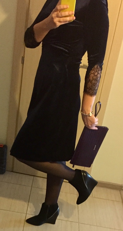 Я выкладывала здесь фото с этим же платьем. Оно требует туфель. Ни ботильоны, ни сапоги сюда не катят. Я на такси в кафе ездила, сразу в туфлях, от двери до двери