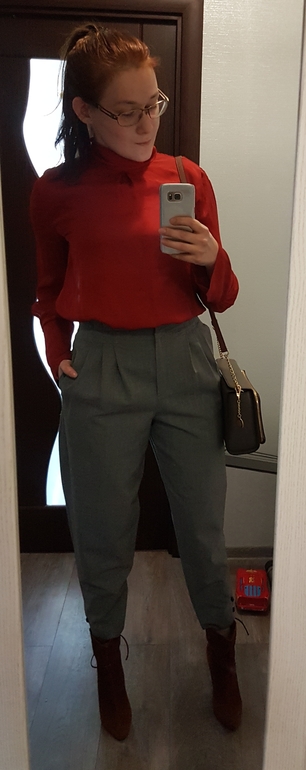 Ну точно деловая колбаска) очень круто и блузка шикарная. Мне тоже очень нравятся галифе, но муж их ненавидит говорит похожа на бабушку поэтому я в пролёте, он признает только классику, а я от неё уже устала и не дай бог я куплю что то с завышенной талией сразу говорит что я похожа на гнома, печалька вообщем... и да у тебя здесь прям просится шпилька.