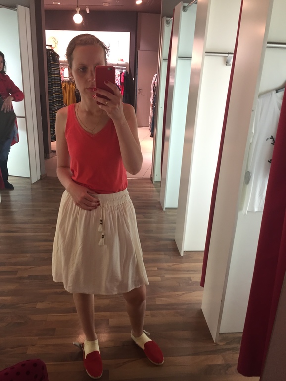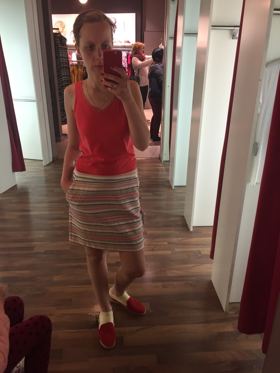 Да, поняла в последнюю неделю, что нечего одеть )) В итоге ушла ни с чем. Сделала вывод, что юбки на талии не моё (( длинная выросла эхех. Прихватила только красную майку, чтобы после часа примерки с пустыми руками не уходить ))