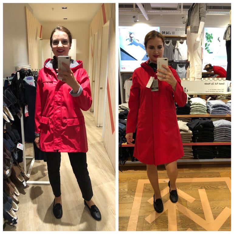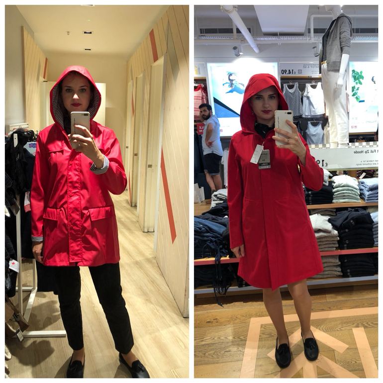 Сто лет мечтала именно о красном доеждевике. В итоге купила тот что слева (но еще могу вернуть), и вот буквально на следующий день после покупки нашла еще один в Uniqlo и теперь не могу успокоится и определится: какой дождевик выбрать? какой лучше на мне сидит?