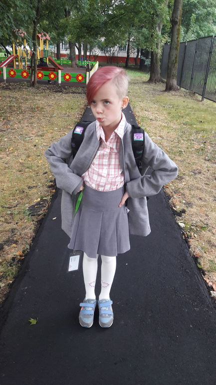 Крутая девочка! 💎 Стрижка классная, я себе и среднему сыну недавно такую сделала). У старшего самурайская прическа, а у младшего каре до плеч))). Волосы красить не хотят пока, я на синий их подбивала. Тоника синего цвета даже смываясь смотрится неплохо). А по-поводу формы, в нашей школе её нет). Ооочень удобно. И выделяются, скорее, школьники в классической одежде и с классическими прическами. Школа у нас креативная, с творческим уклоном, здесь многие не такие как все))). Виоричка супер!!!