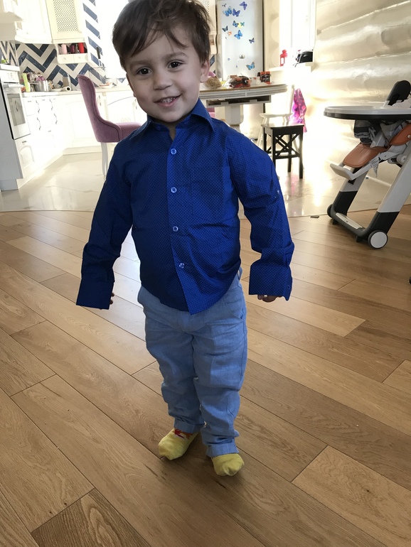 Симпатяга! Ему все к лицу) Но рубашка по размеру не подходит. Наденьте с якорями, низ оставьте этот же