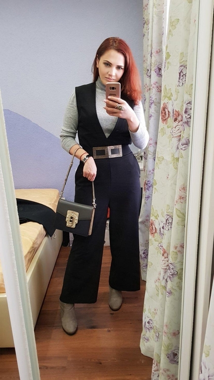 Красотка)) обувь только тебя здесь режет..никак не ремень.. и блузочку яркую под такой комбез👍.