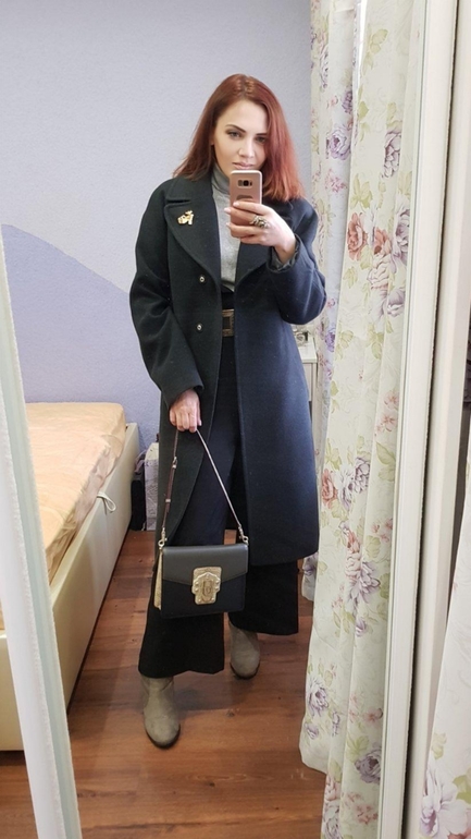 Я его и носила раньше с чёрными сапогами узкими по ноге. Но тут захотелось серого намешать. У меня пальто ближе к серому с светлой ниткой лёгкой, водолазка, сумка.. решила добить сапогами :))