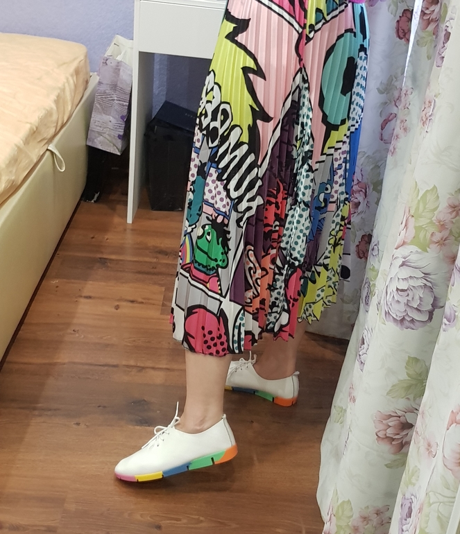 Кеды за такую цену вообще удивили. Реально кожа, мягкие, лёгкие. Подошва эта колоритная. Я их под эту цветную юбку хапнула. А по факту, чувствую я их затаскаю весной подо всё. Прям понравились.