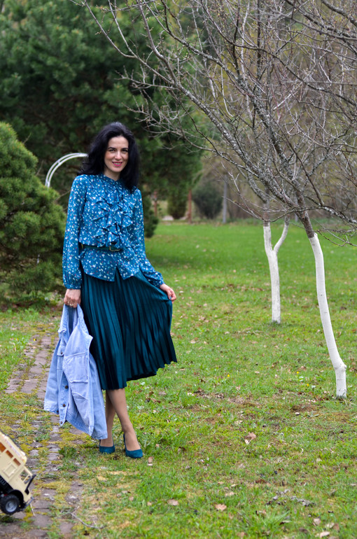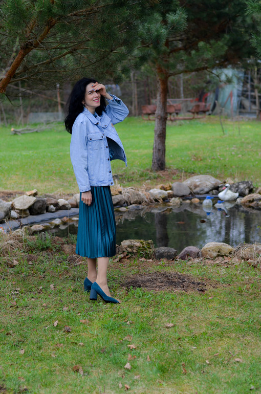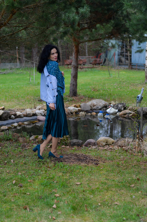 Пригласили нас на дачу, на день рождения. Вроде бы дача.... надо одеться попроще, а вроде бы день рождения, надо прилично выглядеть. Поэтому любимый романтичный образ сбила обычной джинсовкой) В траву не лезла, ходила исключительно по дорожкам, так что туфли не мешали)