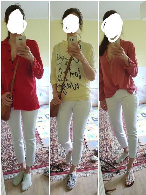 Какие нибудь топы, футболки. Брюки же летние, рубашки сюда эти совсем не в тему. И дело даже не в том, что нужен объемный верх, не обязательно. Просто диссонанс какой то получается.