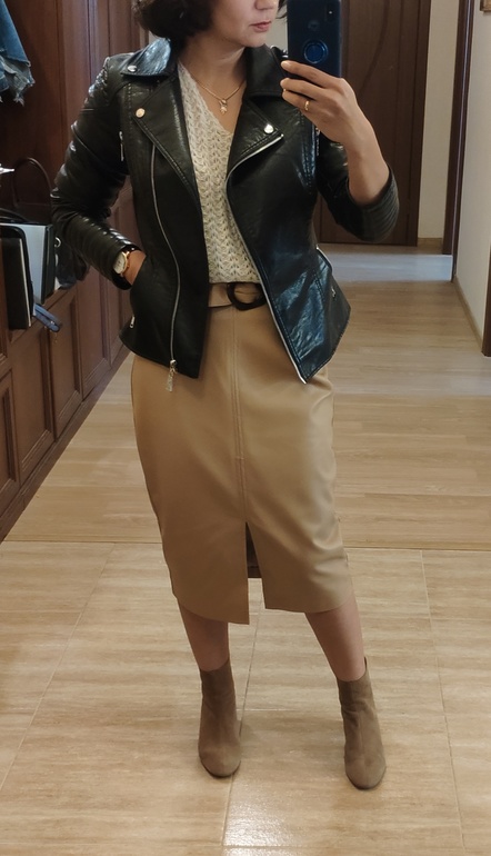 Мне только косуха понравилась 👍 Первый джемпер слишком сопливый, второй слишком вязаный, юбка большая, а обувь только под миди юбку или брюки укороченые или кюлоты. А так режут ногу.