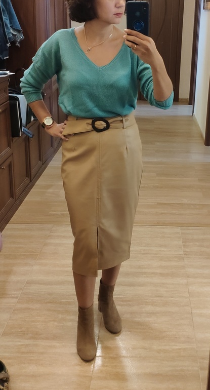 А мне нравится все! Ноавится, что юбка сидит свободно, не сковывает и выглядит это очень актуально, нравится сочетание фактур (вязка, кожа, замша), нравится сочетание цветов и модели, нравится как на вас село.