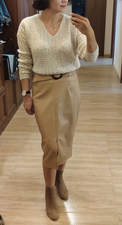 Пуловер голубой понравился, бежевый нет. Слишком сложная фактура, под ним теряется форма. И в то же время недостаточно брутальный как например свитер с толстыми косами. Юбка тоже нет. Но это уже личное, я кожзаменитель не люблю. В нем жарко, и колготки цепляет.