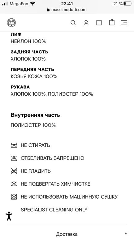 Категория недовольстваприсмотрел себе муж куртку в MD, а ее ни стирать, ни химчистить нельзя. Консультант на вопрос - что это за одноразовая вещь за 18000р развёл руками и сказал, что с такими ярлыками у них и свитера есть. Будьте внимательны