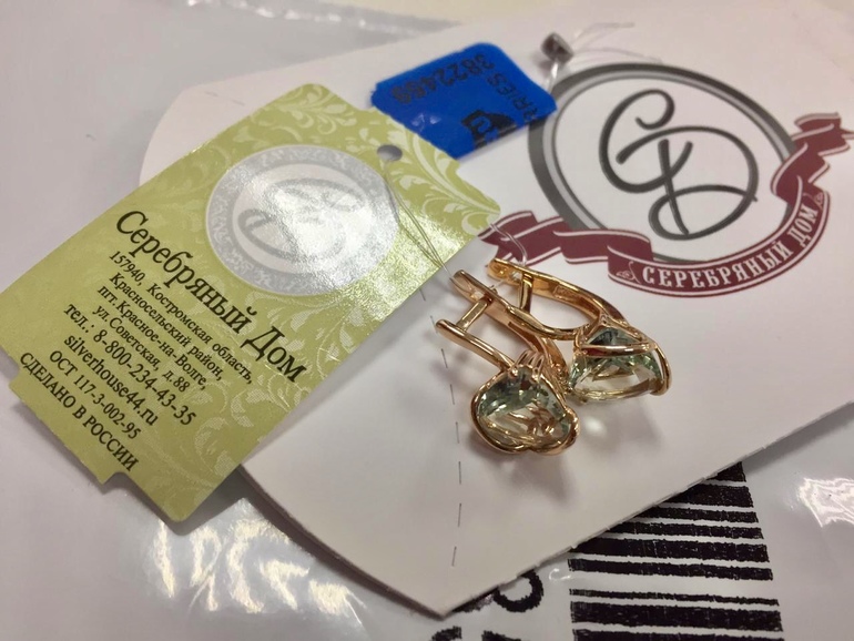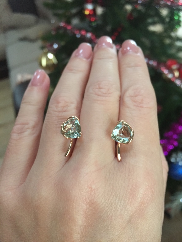 Камень напомнил бутылочное стекло. Не украсил. Интуитивно понимаю, что нужно оформление в жёлтом металле. Так в в нем появляется теплая золотистая искорка. Также имеет значение огранка- чем больше граней, тем удачней оттенки камня переливаются при свете. Искала и нашла. вот они, серьги с празиолитами, которые ДМ принес в Новый Год.