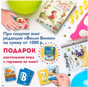 При покупке книг редакции «Вилли Винки» на сумму от 1000 рублей вы получите в подарок настольную игру «Команда Вилли Винки». Все герои игры придуманы талантливыми авторами и имеют свой неповторимый характер. Хотите познакомиться с ними поближе? Добро пожаловать мир книг «Вилли Винки»! Подробнее о акции читайте здесь