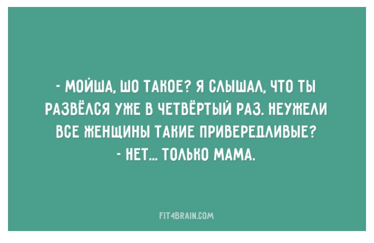 Встретились две подружки. "Ну как твоя семейная жизнь? " - интересуется одна. "Да какая там жизнь, - вздыхает другая. - У него один свет в окошке - его мамочка, только вокруг нее и танцует... " - "А ты посмотри на себя, - говорит подружка, - нечесаная, в мятом халате. Попробуй встретить мужа надушенной, в шикарном белье, увидишь; он и не вспомнит про свою мамочку". В тот же день молодая жена купила дорогое французское черное белье и вечером встречает своего мужа "во всеоружии", но он в ужасе шарахается от нее: "Боже, ты вся в черном - что с мамой?.. "