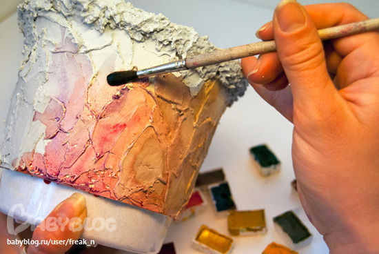 Акварелью, довольно сильно размывая ее водой, подкрашиваем получившийся рельеф после высыхания. Оттенки выбираем в соответствии с выбранным элементом салфетки для декупажа. Пигментные частицы акварели хорошо оседают в неровностях грубой пасты, выявляя рельеф и делая ее похожей на фреску. Оставляем просохнуть.