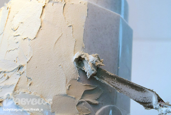 Часть грубой пасты я наношу мастихином в разных направлениях, чтою получались грубые мазки и таким образом покрываю все кашпо. А в часть добавляю наполнитель – это может быть и песок и просто крупа, и выкладываю по краю кашпо. Оставляю до полного высыхания на сутки.