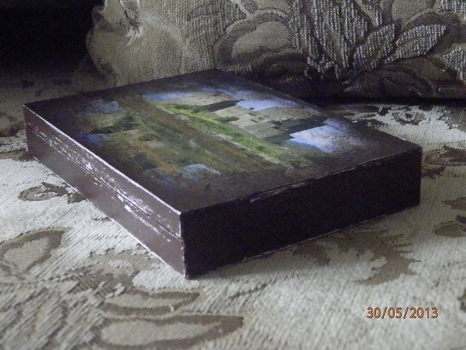 Хотелось как-то состарить, поэтому углы натерла свечкой, сверху акриловая краска, потом наждачкой прошлась и все покрыла лаком.