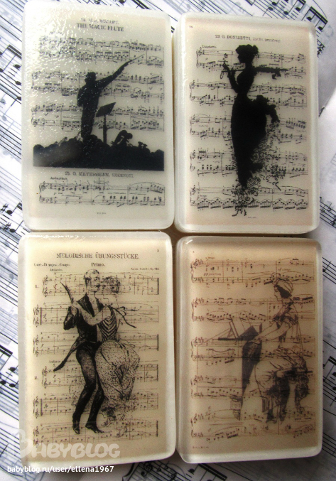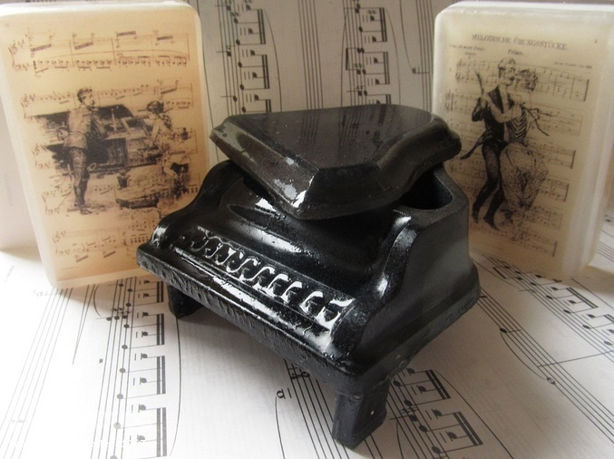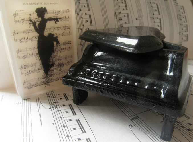 Эта форма мне поддалась не сразу. Но теперь я влюбилась в него. Скамеечку залила, потом просто переплавила. Не понравилось с ней. В рояль тоже не стала класть ни бисер, ни соль. Попозже в нем будут белые розы, когда формочка будет с махонькими розочками. А пока что вот такие наборы для учителей в музыкальную школу . Рояль и открытка.