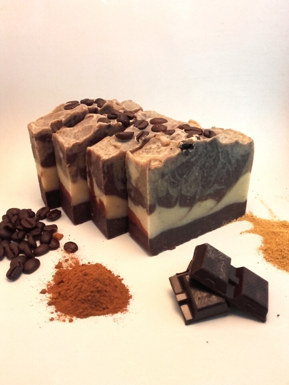 Какао,имбирь,корица и кофе.позавчера пока разрезала кусочек девченкам,одна успела откусить,надо предупреждать сразу что это мыло))