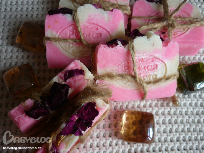 Мыло с лепестками роз - кокос, касторка, пальма, в уходе - Ши, аромат - Свежесрезанные розы.