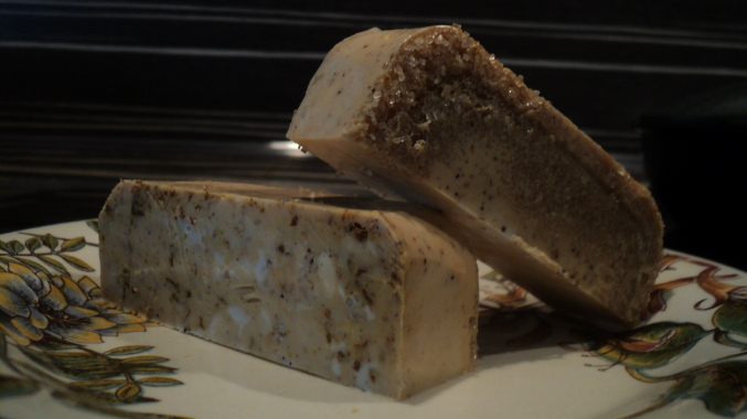 Имбирно лимонный скраб с тростниковым сахаром и добавление молочно медового мыла, состав: белая основа, тертый свежый имбирь, цедра лимона, корица, базовое масло облепиха, эфирные масла: лимон, корица + белая основа, сливки 10%, овсяные хлопья, мед, мускатный орех, базовое масло - миндальное, эфирные масла: корица, гвоздика.