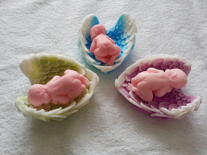 Мыло из основыэтми голопопиками в крыльях, но все же, выложу фотографию. Подруга заказала в ночь 3х ангелочков, при чем указала, каких цветов должны быть крылья)) Фиолетовыми и голубыми я уже делала, а вот салатовые получились, на удивление, красивыми.