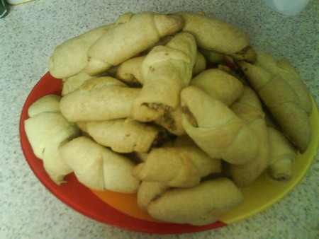 Замесить тесто так чтоб оно било мягким, но отлипало от рук. Тесто раскатать в пласт толщиной 4-5 мм,разрезать в форме треугольников ( 8 частей ) На каждый положить начинку ( на широкую часть треугольничка ) и завернуть трубочкой.