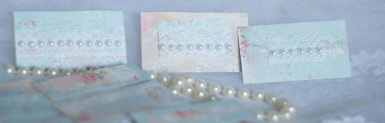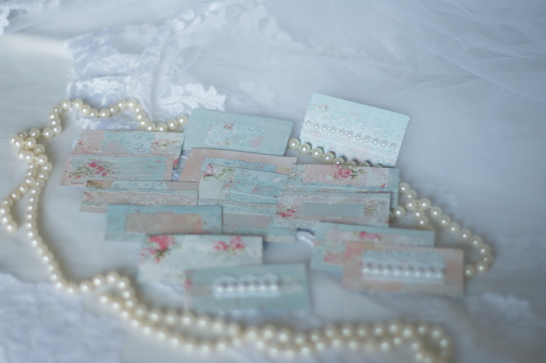 Визитки выполнены в стиле шебби шик. В декоре использовано хлопковое кружево и полубусины под жемчуг.