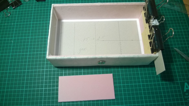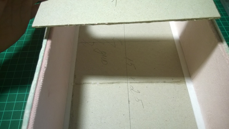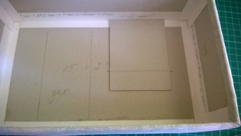 когда с перегородками закончили, делаем донышки. Для этого вымеряем все линейкой, вырезаем из картона детальки, обклеиваем тканью, по желанию прослаиваем синтепоном