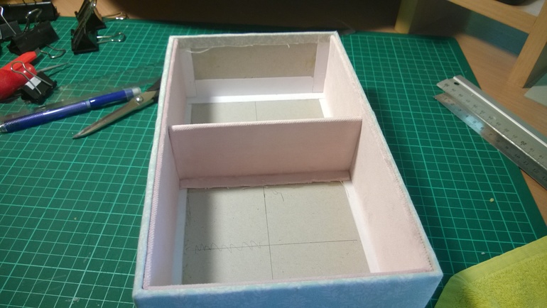 приклеиваем и укрепляем плотной бумагой с 2 сторон (как мы укрепляли короб) Почему-то я не сфоткала этот момент. Высоту перегородки я делаю на0,5 см ниже внутренних стенок. А все последующие перегородки еще ниже, для удобства.