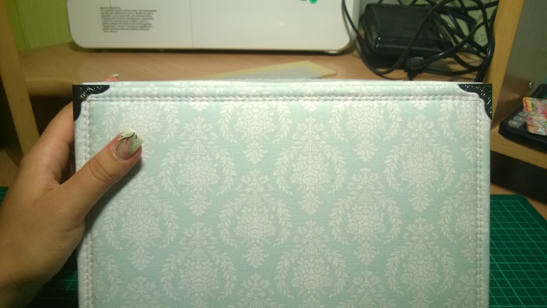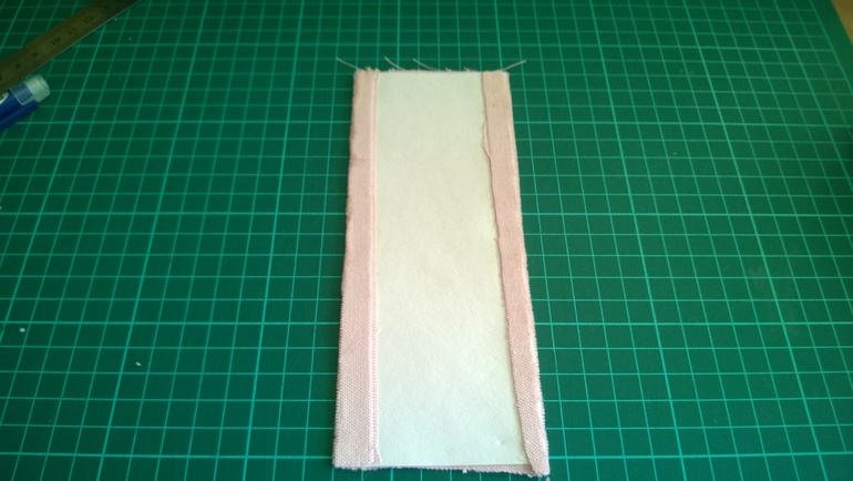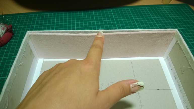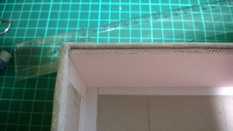 Натягиваем ткань. Можно сперва приклеить на клей карандаш синтепон, а потом ткань, а можно нанести пва на картонку, приклеить ткань, затем сперва длинные стороны, потом короткие. Я выбрала 2 способ.