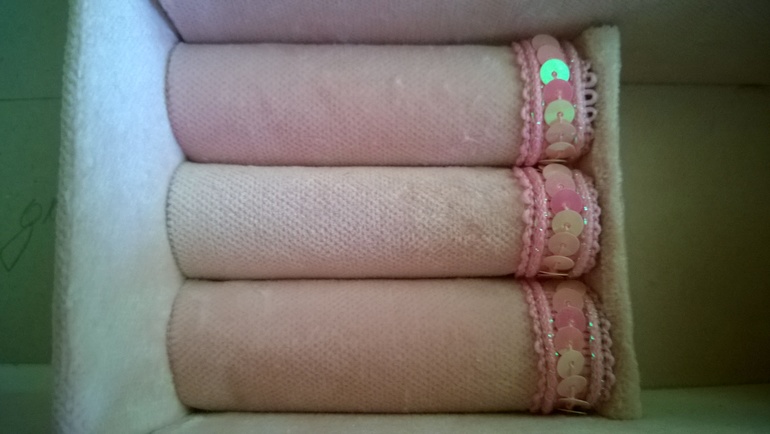 Далее можно взять отрез ткани по ширине валиков и переложить валики, а по краям украсить ленточкой или кружевом, тем самым скрыв края ткани, а можно взять листик бумаги, обернуть тканию: