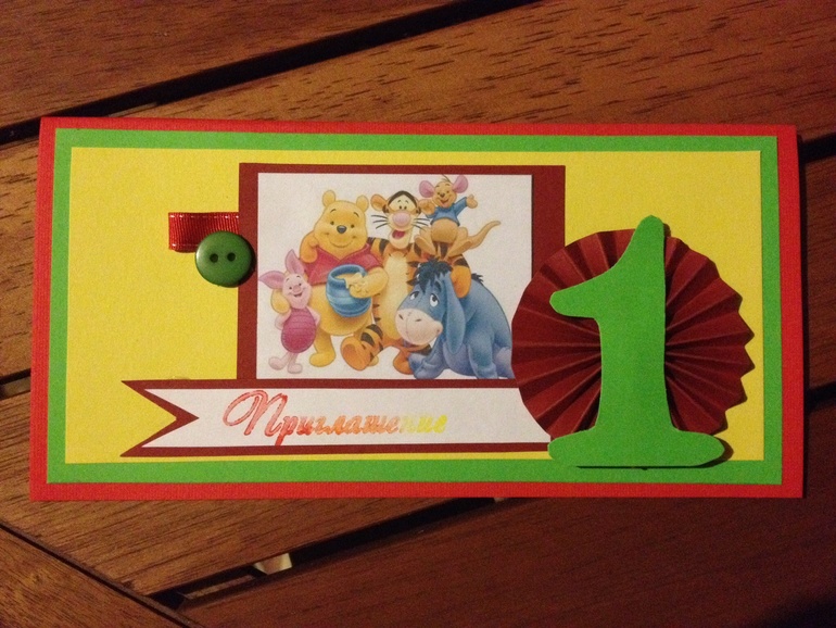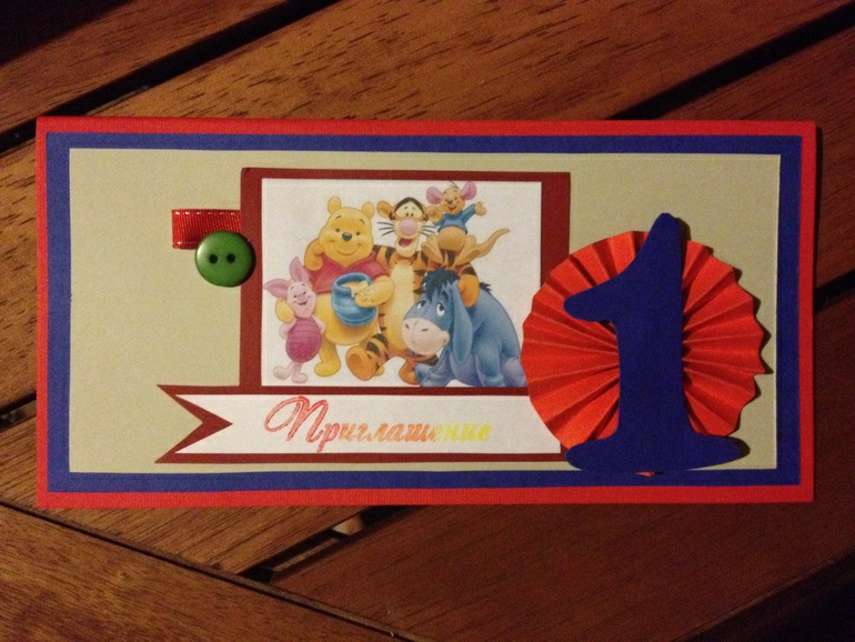 Хочу критики!!!Здравствуйте дорогие девочки! Почему-то я считала своим первым знакомством со скрапбукингом наш фотоальбом, а ведь до него я сделала пригласительные на наш первый день рождения, который планируется быть оформленным в стиле американского Винни Пуха :)