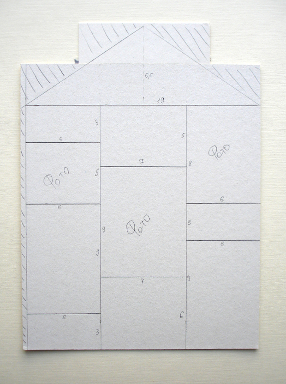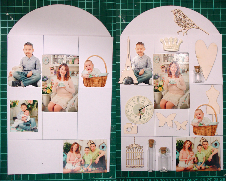 ШБ могут быть различных форм, я предлагаю сделать коробочку с ячейками разной высоты/длины, а сверху будет чердак, крыша может быть как у домика или круглая как купол, можете выбрать любую форму, а для того что бы определиться с размерами ячеек, надо хотя бы примерно представить свой ШБ. Для первого ШБ я выбрала круглую крышу и у меня были фотографии с фотосессии семьи моей сестренки. Фотографии можно оставить просто прямоугольными, а можно вырезать главных героев по контуру (что я и сделала). Именно размеры фото и задали мне размер всего ШБ, если у вас фото не будет, то можете ориентироваться на свои фигурки из чипборда, в крайнем случае на мои размеры. Только не делайте ячейки слишком большими, что бы не было пустоты слишком много. Мне кажется что, чем больше ячеек, тем интереснее их рассматривать. Когда примерный план есть, то можно приступать к самому фону ШБ (фоном я буду называть заднюю стенку ШБ).