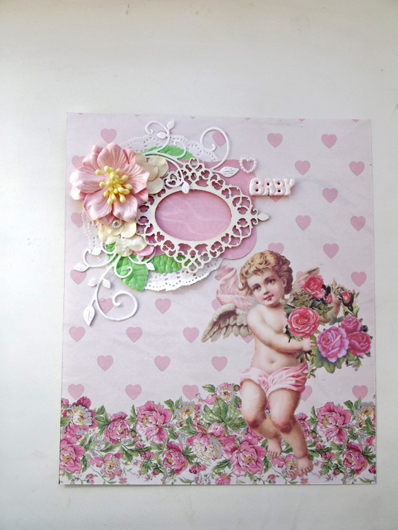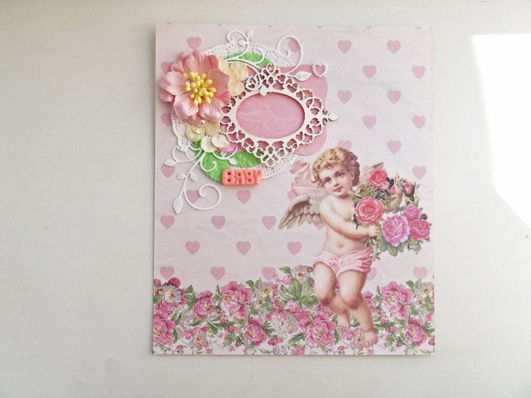 Хочу критики!!!Девочки, нужен ваш совет! Решила сделать альбом для дочки (в скрапе я мягко говоря новичок). Посмотрите, где лучше сделать надпись BABY? Или не делать совсем (в рамочке сначала хотела дату рождения написать)???