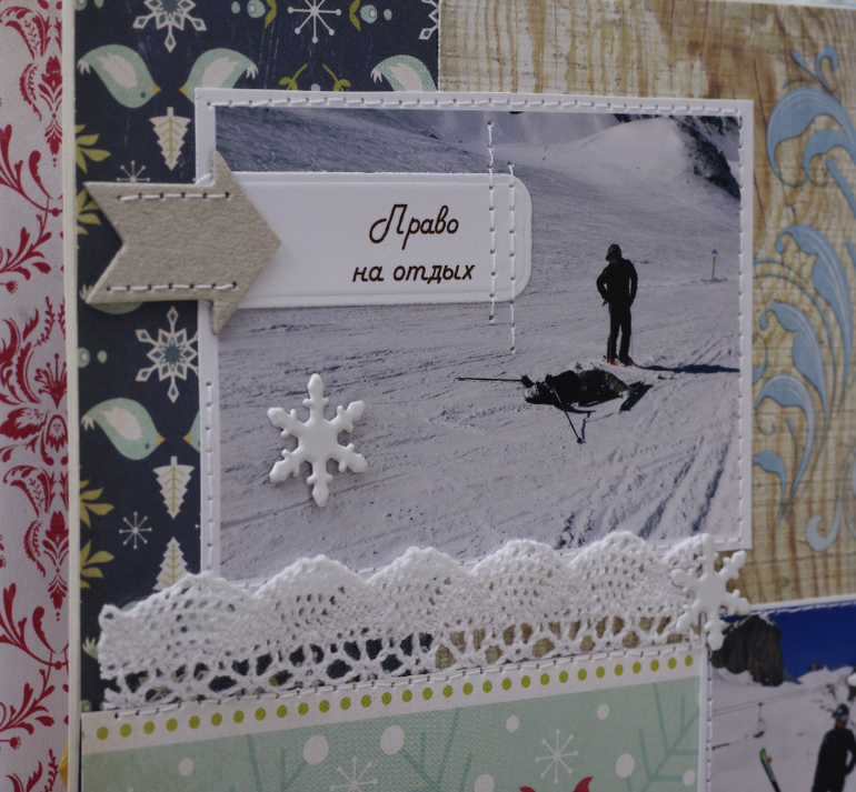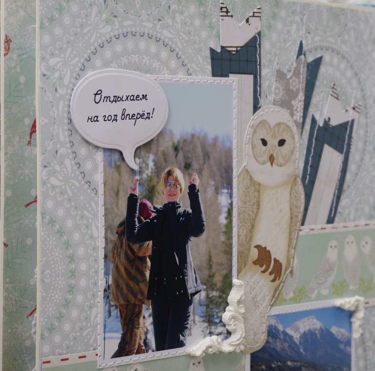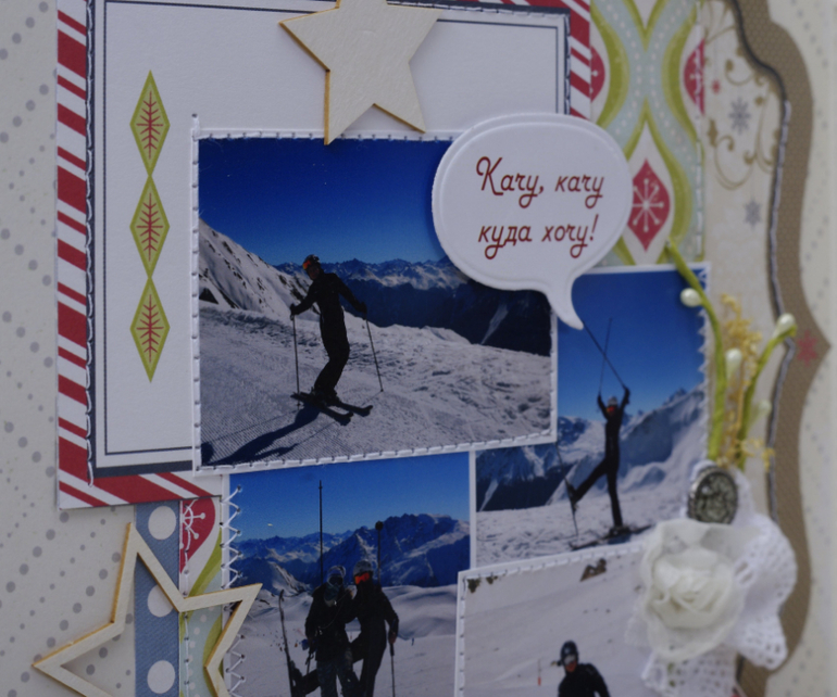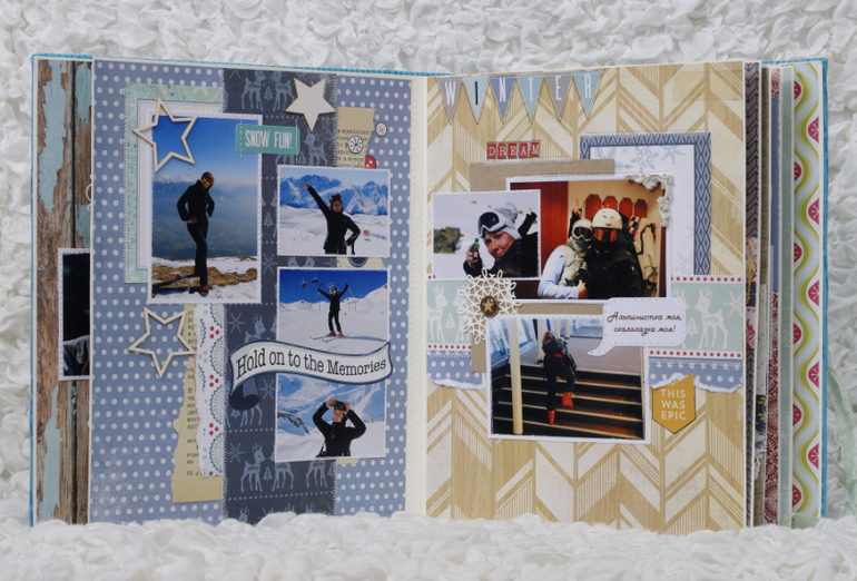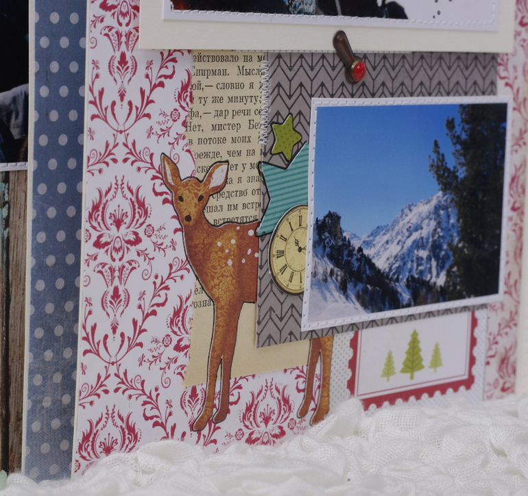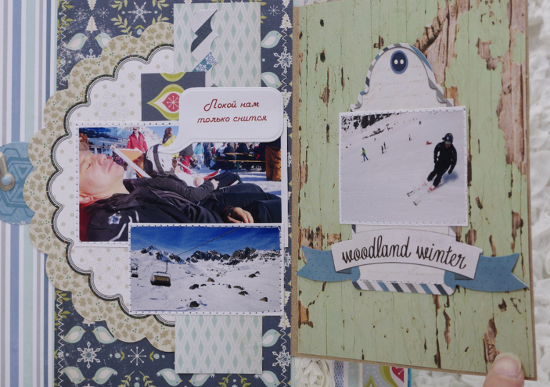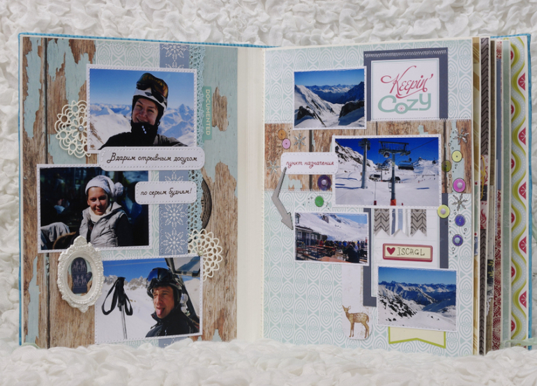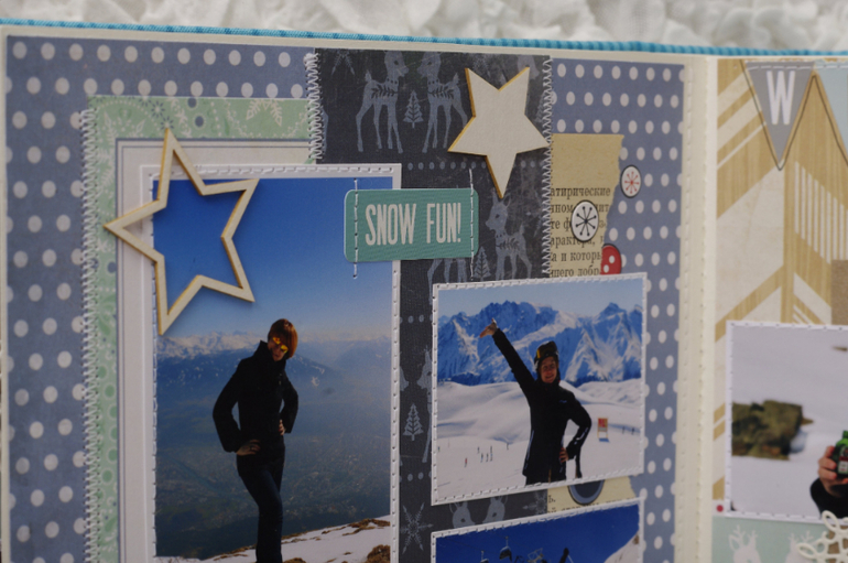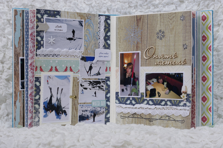 Просто чудесный альбом! Все фото смотрятся в нём гармонично. Но позволю себе мелкую критику-по такой обложке (детская ткань, узенькая шебби ленточка, оленята) невозможно и подумать какая внутри красота! Думала, что детский альбом про прогулки с санками. А тут горнолыжный курорт! Хочется кое-что слифтить, очень уж красиво.